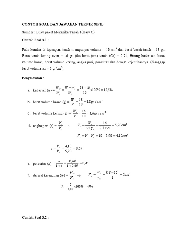Buku paket mekanika tanah 1(hary c) contoh soal 3.1 : Contoh skripsi teknik sipil manajemen konstruksi pdf. 20200930 modul 5 daya dukung tiang tunggal pdf free download teknik sipil w i n n i l i c i o u s daya dukung pondasi dengan analisis terzaghi bahan uts bahan ajar pondasi 2 contoh soal pondasi dangkal pdf document. Pada kondisi di lapangan, tanah mempunyai volume = 10 cm 3 dan berat basah tanah = 18 gr. Umur maksimal 25 tahun dan berpengalaman minimal 3 tahun. Berat tanah kering oven = 16 gr, jika berat jenis tanah (gs) = 2,71. Teknik sipil wa civil engineering. Berikut, 50 contoh soal cpns seleksi kompetensi bidang (skb). Pada sebuah daerah irigasi, evapotranspirasi potensial (et0) penman modifikasi adalah 2,8 mm/hari. Persentase butiran yang lolos ayakan no. Setelah kita membahas berbagai contoh soal tes kompetensi dasar tkd di 110 contoh. Berat tanah kering oven = 16 gr, jika berat jenis tanah (gs) = 2,71. Buku paket mekanika tanah 1(hary c).
